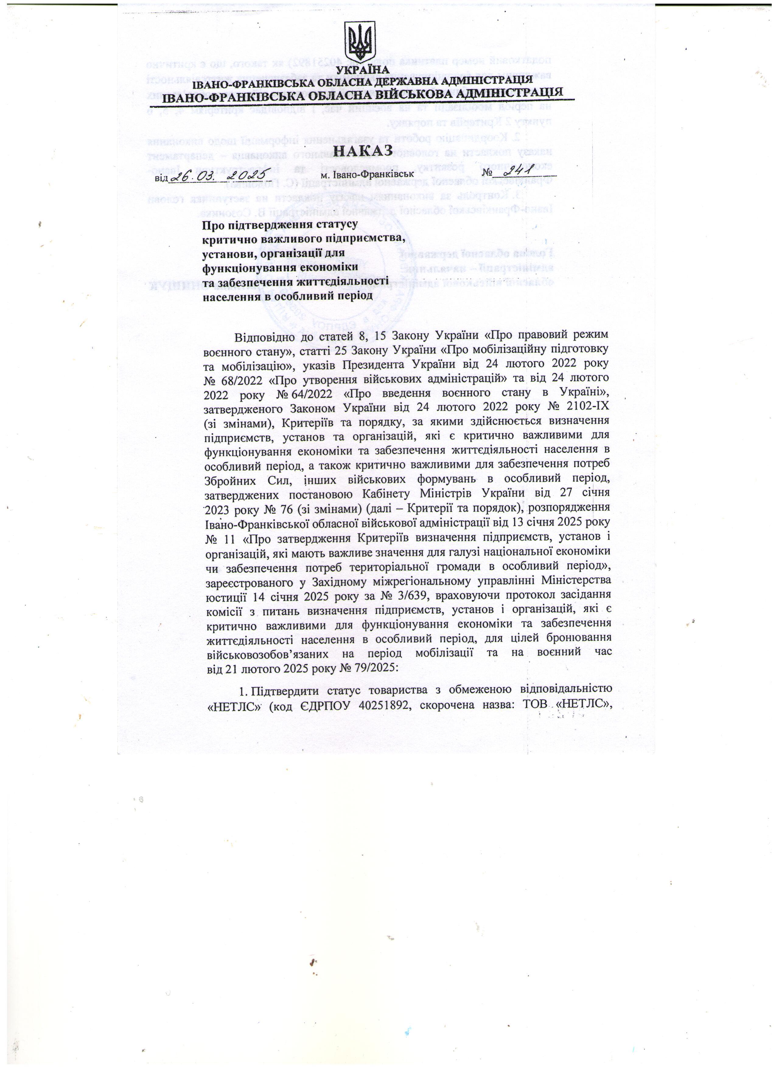 НЕТЛС ТОВ визнали критично важливим підприємством Івано-Франківською обласною адміністрацією другий рік поспіль під час особливого періоду мобілізації.